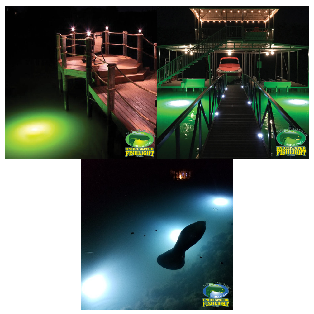 Here at Underwater Fish Light, our dock lights have three color choices to choose from! We have our Classic Series, which is a 175 watt bulb. We also have the Extra Bright Series that is equipped with 250 watt bulb. Our Extra Bright Series sports three different colors; Vibrant Green, Natural Green, and Caribbean Blue!