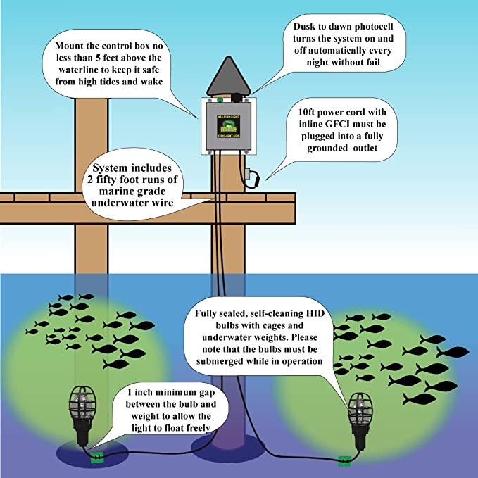 Our Underwater Fish Light brand of dock lights create what we like to call a “Backyard Aquarium”. Our systems simply enhance the natural food source in the waterway, we can guarantee you’ll see fish! All of our fish lights for docks have photocells that automatically turn the system on every night at dusk and off every morning at dawn. The continued nightly use will create a feeding cycle for the fish, to keep the fish coming back every night!